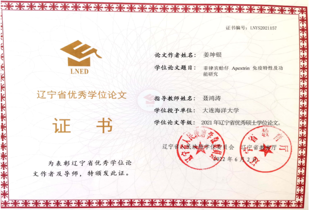 指导和培养了一批优秀的研究生,其中2人获辽宁省优秀硕士学位论文、3人获辽宁省优秀毕业生、6人获研究生国家奖学金,7人获2022免费白菜大全论坛优秀硕士学位论文。所指导的研究生主要就业方向为高校、企事业单位及继续攻读博士学位等。其中9名毕业生先后考入中国海洋大学、大连海事大学、福建农林大学等高校攻读博士学位。定期组织研究生参加国内外学术研讨会,交流分享学术前沿,开拓研究生视野,提高研究生科研前瞻性。
